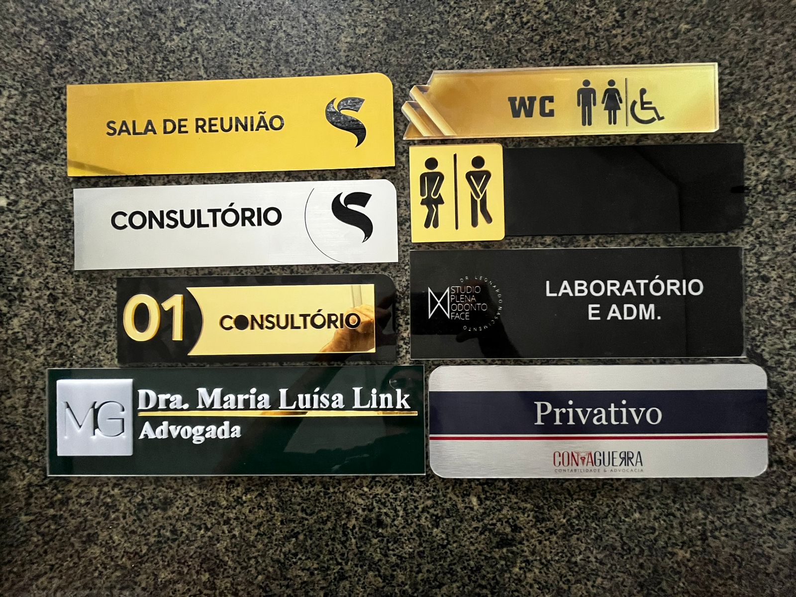Soluções ideais para sinalização e comunicação visual. Escolha o material (Acrílico, PVC, PS, ACM) e o formato ideal para seu projeto, seja para sinalização de escritórios ou placas decorativas com corte especial.